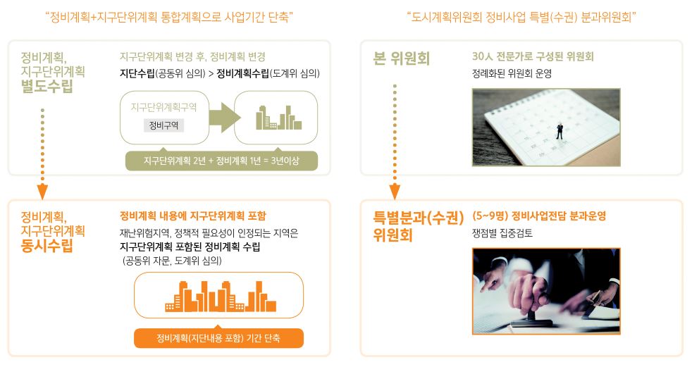 정비사업을 진행하기 위해서는 기존 지구단위계획 변경을 통한 정비구역을 지정하고 추가적으로 그에대한 정비계획을 수립하는 단계가 있어 사업 진행 초반부터 긴 사업기간이 소요가 되었었습니다. 또한 해당 단계별 도시계획위원회의 심의 과정을 거치는데 있어 각 분야별 여러 전문가들로 구성 된 심의위원들이 다수 존재하여 쉽게 의견을 일치시키기 어려워 더욱 사업의 지연이 발생하곤 하였습니다. 하지만 신속통합기획을 통해서는 정비계획 수립 시 지구단위계획의 변경 내용을 함께 포함하여 진행할 수 있게 수정하였고 또한 소수로 구성 된 특별분과 위원회를 새로 두어 사업 지연이 최대한 발생시키지 않도록 조치하고 있습니다.
